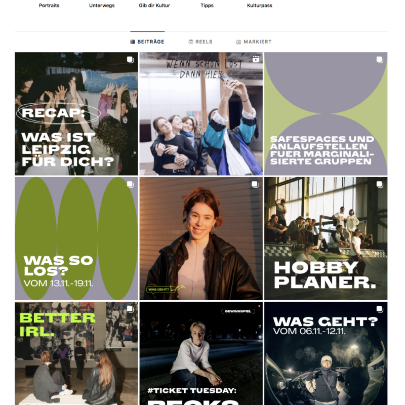 Um das zu ändern, durfte ich in Zusammenarbeit u.a. mit der Leipziger Agentur ungestalt eine Social Media Kampagne entwickeln, die 2023 erfolgreich auf Instagram umgesetzt wurde. Ziel war es, über den Instagram-Kanal @dasistleipzig die Zielgruppe regelmäßig mit Veranstaltungstipps und Insights aus der Kulturszene zu versorgen.